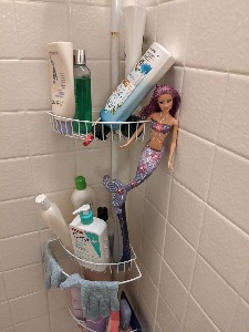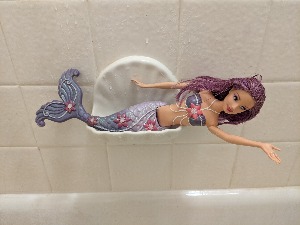 My daughter has a mermaid, and she lives in our shower. More specifically, her home was the wall mount soap dish, where she was usually left to grab on to the first body part that came near. I was constantly knocking her out of her shell-themed throne. I couldn't bring myself to evict her, even though I thought about it...often (insanity, I know!)
